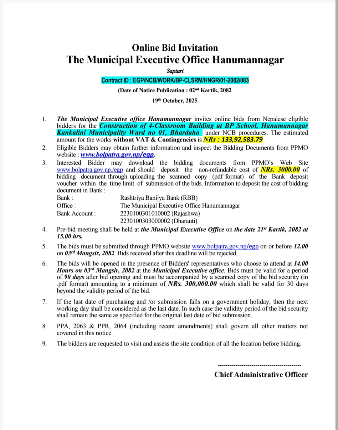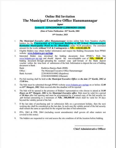 बोलपत्र आह्वान (बि.पी स्कुल भारदह चार कोठे भवन निर्माण )
